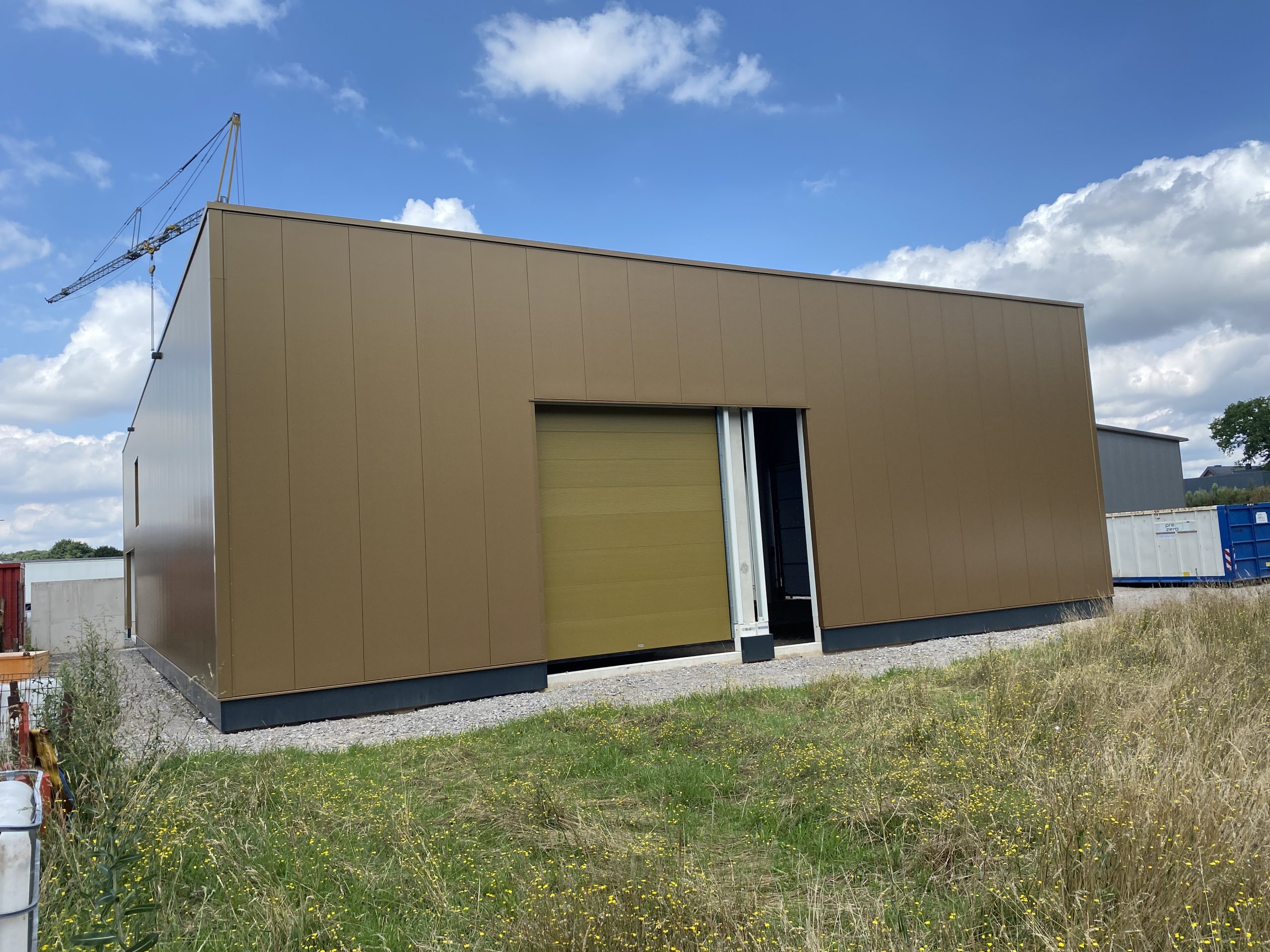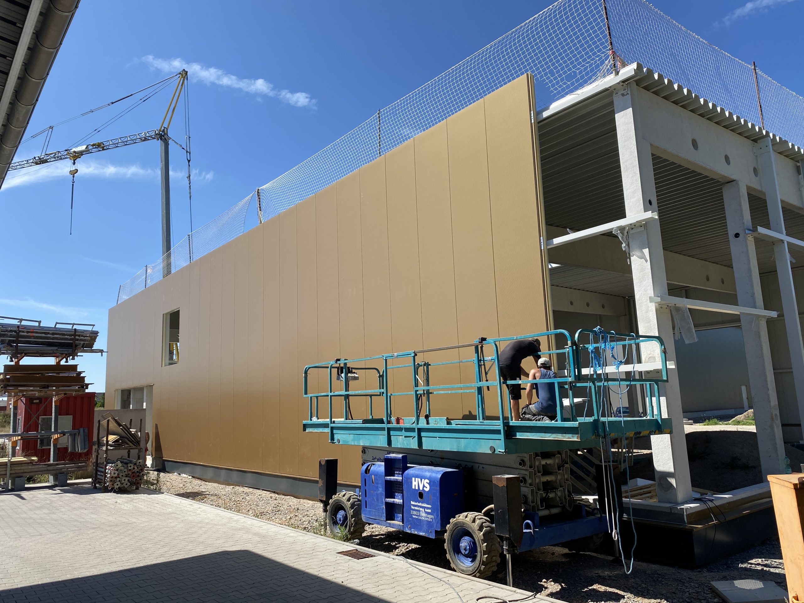 Wandunterkonstruktion, Thermowandfassade in Perl Gold, Dachtrapezbleche, Dachdichtband, einschl. RWA, Tore in Perl Gold.