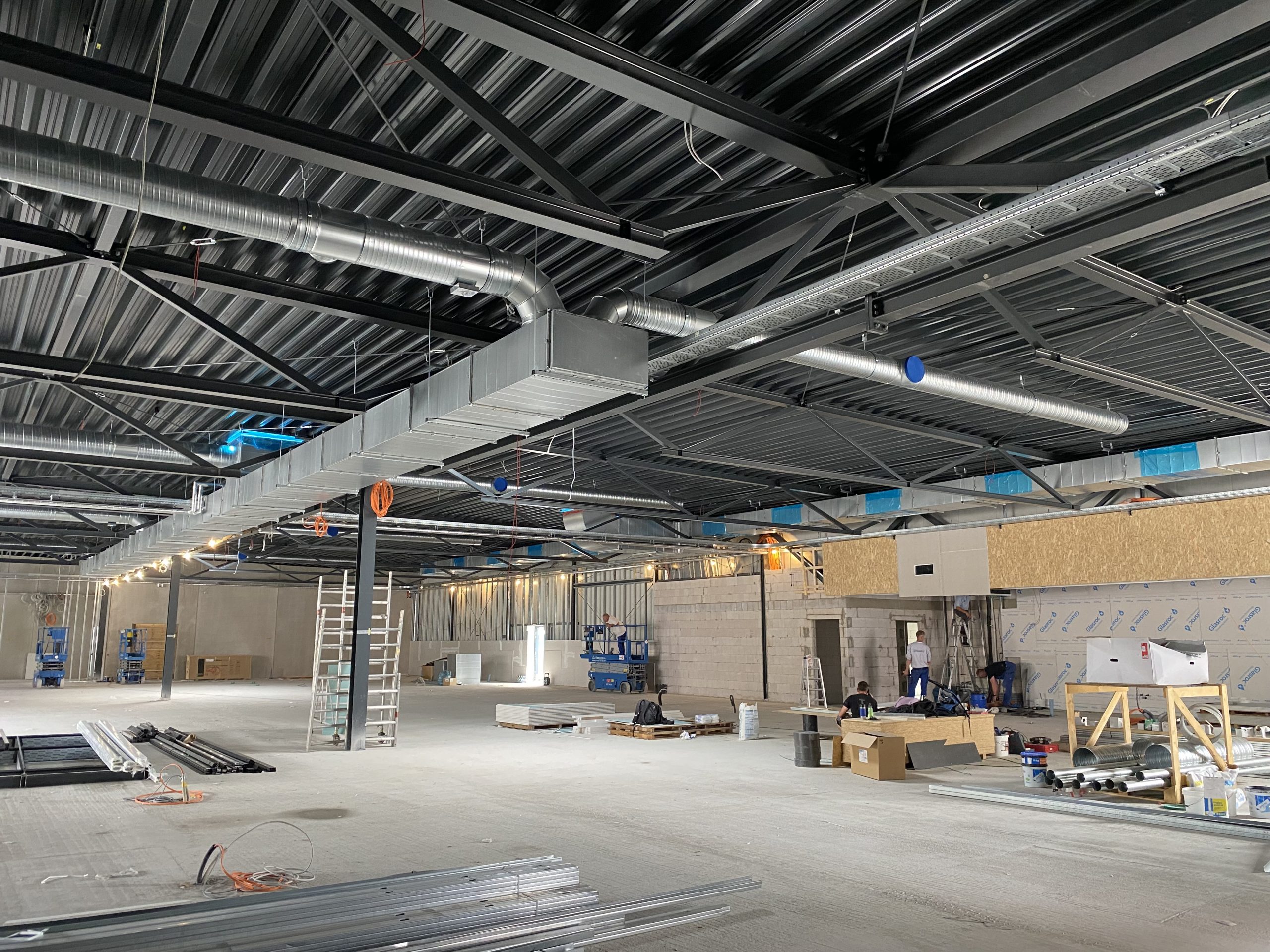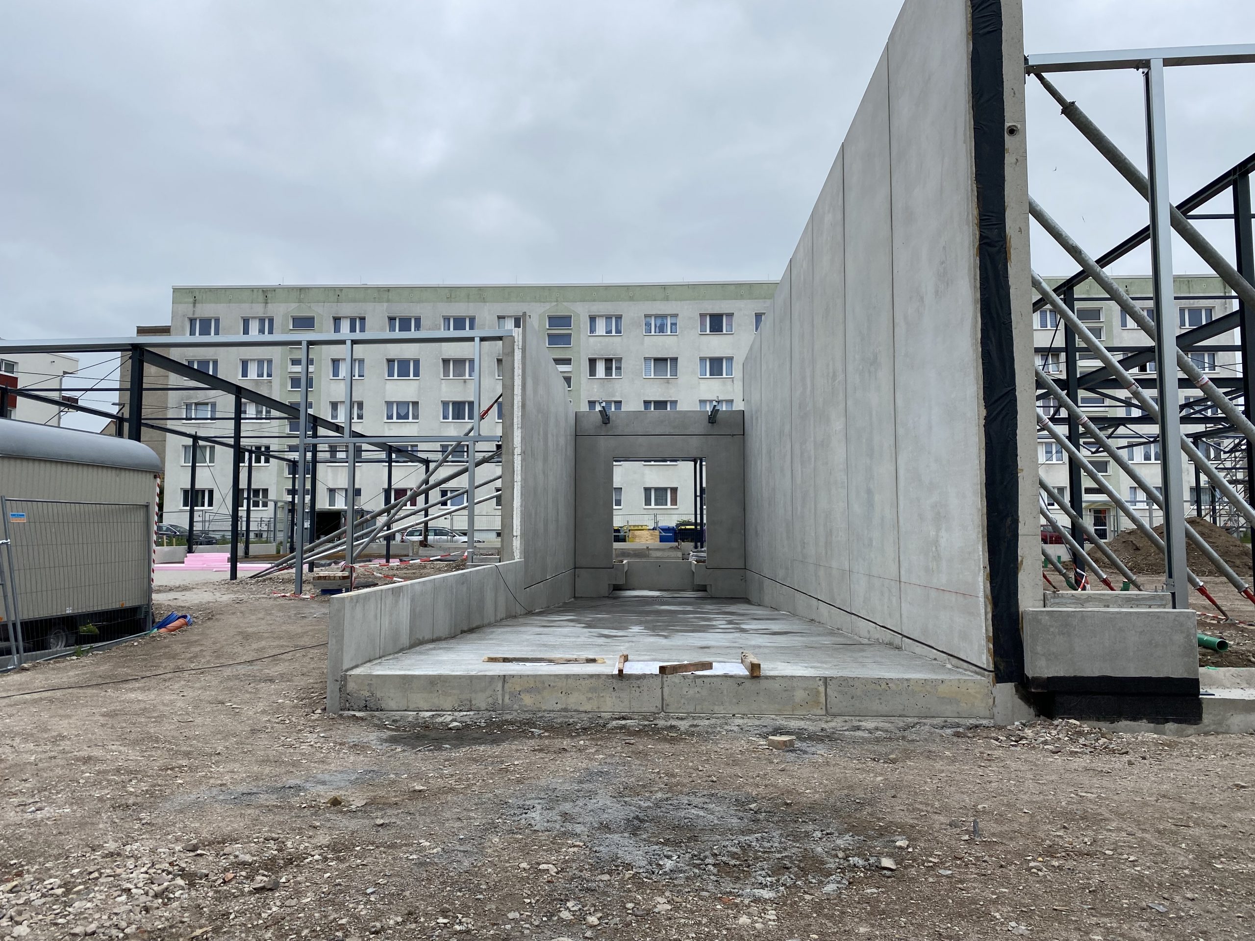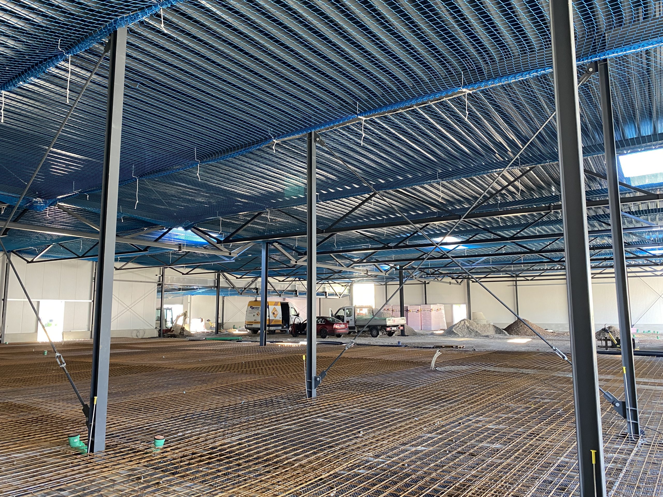 Stahlkonstruktion einschl. Stahlbetonfertigteile als: Sandwichwände, Brandwände und gedämmte Sockel, Thermowand, Dachtrapezbleche, Dachdichtung, Lichtkuppeln einschl. RWA