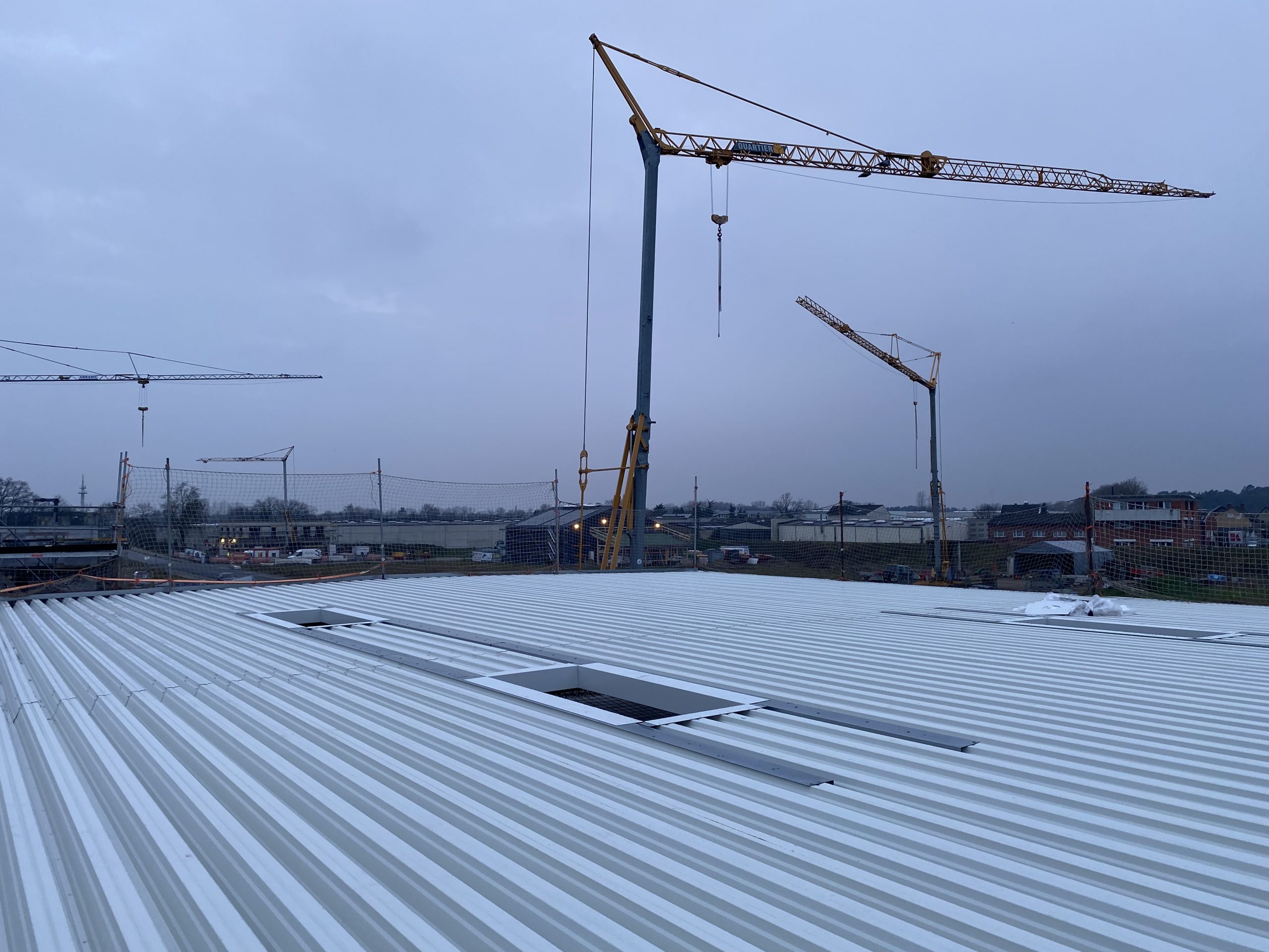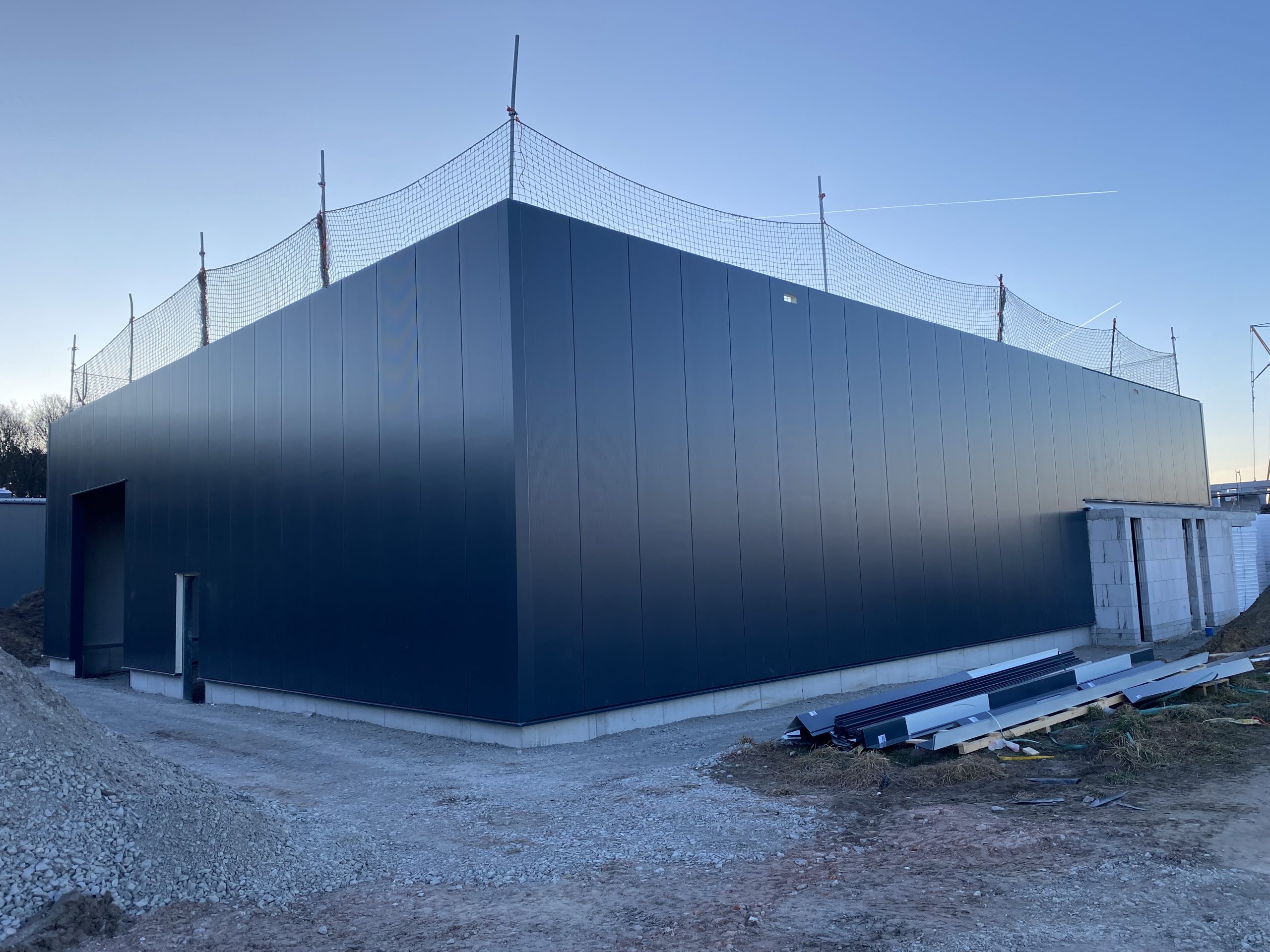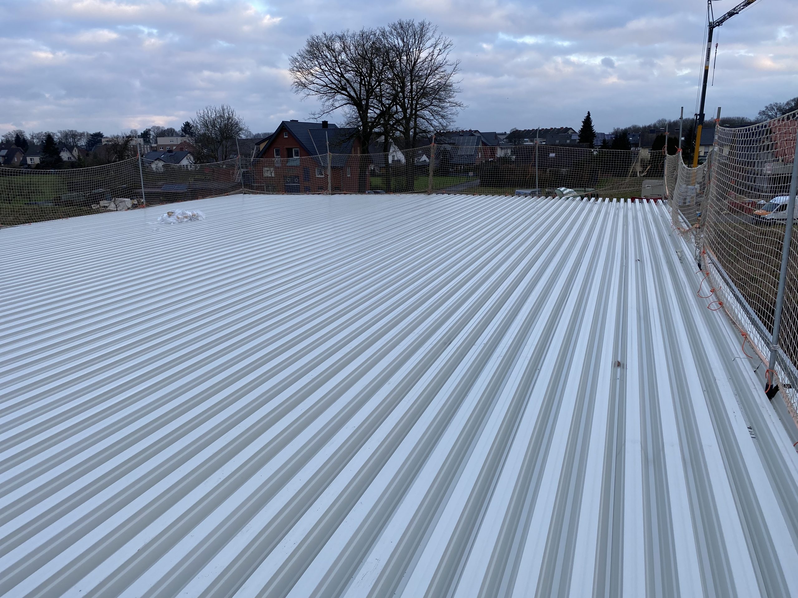 Stahlbau, Thermowandfassade, Dachtrapezbleche, Dachdichtung, Lichtkuppeln einschl. RWA